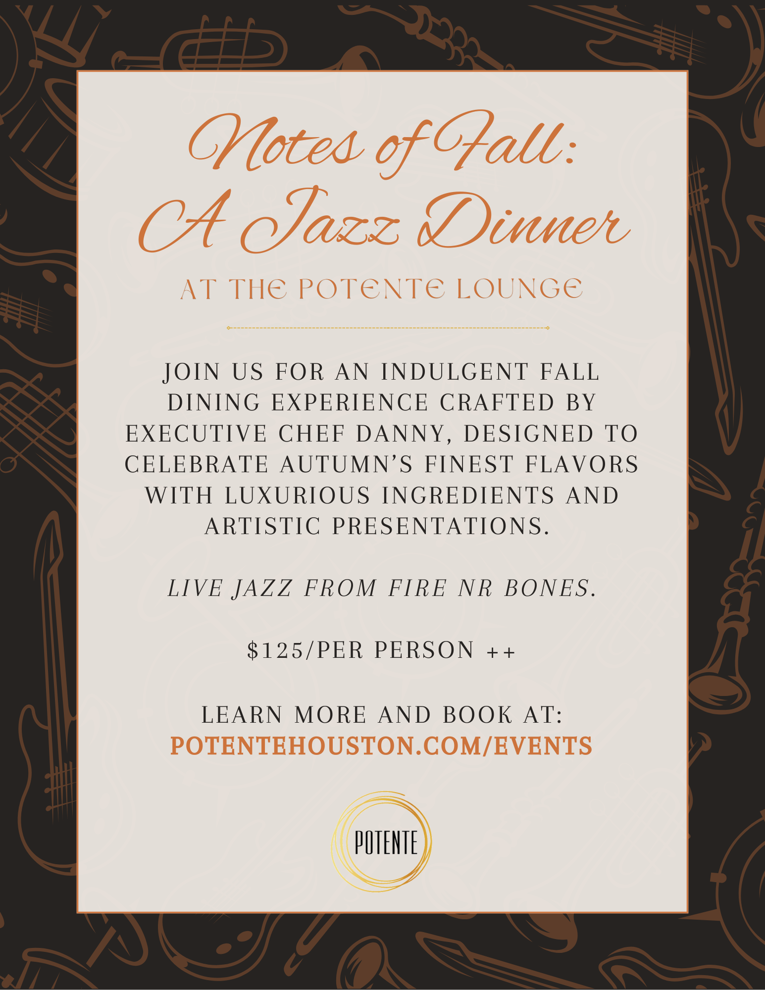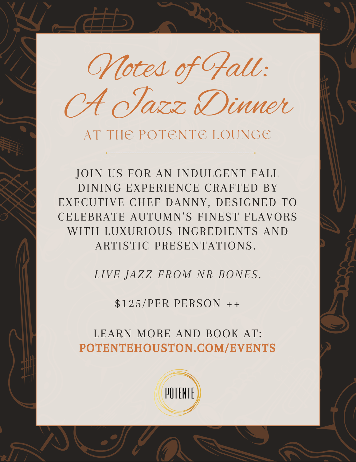 Potente 1515 Texas St, Houston, TXJoin us for an indulgent Fall dining experience crafted by Executive Chef Danny, designed to celebrate autumn’s finest flavors with luxurious ingredients and artistic presentations. Live Jazz from Fire NR Bones. First Course – Elevated Bites + ChampagneAn opening trio of refined small plates, including a Matagorda pearl oyster BLT, rabbit & porcini polpette, and […]