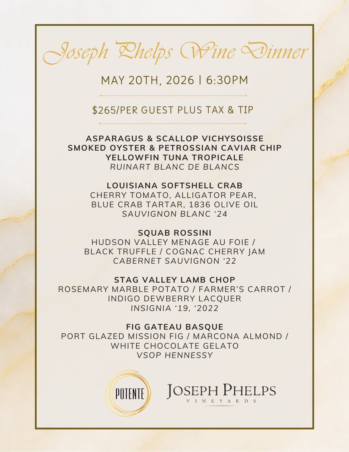 What: Joseph Phelps Wine Dinner When: Wednesday, May 20th at 6:30PM Where: Downtown Houston at Potente _________ Join us at Potente for an elegant evening celebrating the exceptional wines of Joseph Phelps Vineyards, one of Napa Valley’s most iconic producers. This exclusive wine dinner will be hosted by Pip Cardhell, Sommelier and Business Manager for […]
