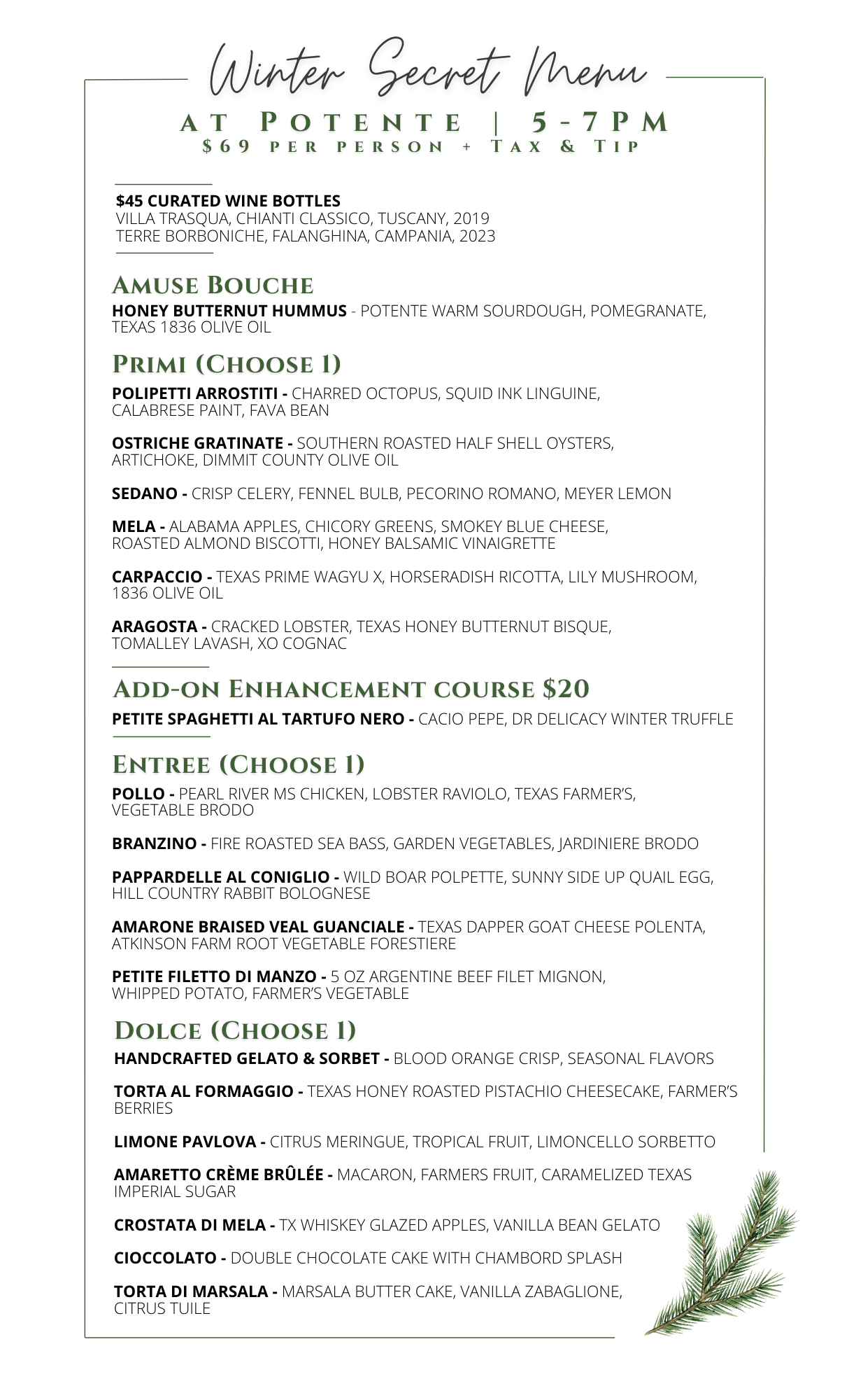 Potente focuses on sourcing local products whenever possible and uses only the highest quality ingredients. The kitchen is overseen by Executive Chef Danny Trace. Chef Danny and his team shop the local Houston Farmers Markets on select Saturday mornings to choose the fruits and vegetables that he will serve at Potente. The modern Italian menu features all wild-caught seafood selections, USDA steaks and homemade pastas. In November 2020, Potente’s truffle pasta was featured as “One of the Best Pastas in the Country” by the Food Network. The restaurant’s boutique wine list features a vast selection of Italian wines, as well as a section of California’s finest vintners. Should you need a recommendation from our wine list, our Sommelier is available during dinner service to assist. In addition to our special collection of wine, a selection of fine whiskeys, scotches, tequilas, spirits, liquors and craft beers are available.
